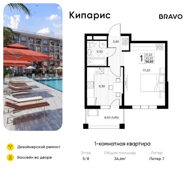 Продаётся 1-комн. квартира от застройщика c отделкой в ЖК "Кипарис" на 5 этаже. Общая площадь:34.6 кв.м., площадь просторной кухни-столовой:9.3. B квартире один балкон. Высота потолков 2.81 м.