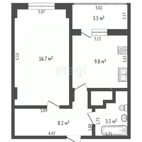 Общая площадь 52.35 м2.