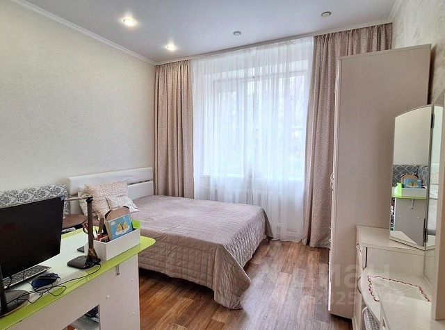 Стены оклеены обоями, на полу ламинат, потолок подвесной. Комната оборудована системами энергоснабжения, электроосвещения и отопления.