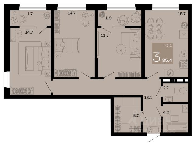 Трехкомнатная квартира в семейном квартале "На Высоком берегу" — это продуманное, функциональное и по-настоящему комфортное пространство для жизни всей семьи. Удобная планировка обеспечивает практичную организацию жилого пространства: из прихожей легко и независимо попасть в каждую из трех комнат. Каждая комната — это отдельная зона уюта и приватности: спальня для отдыха, детская или кабинет для учебы и работы, гостиная для встреч и совместного досуга. Просторная кухня легко вмещает обеденную зону и становится сердцем дома, где собираются близкие. Лоджия с витражным остеклением добавляет света, воздуха и ощущения простора, а также служит дополнительным местом для отдыха с видом на зеленую, благоустроенную территорию квартала.