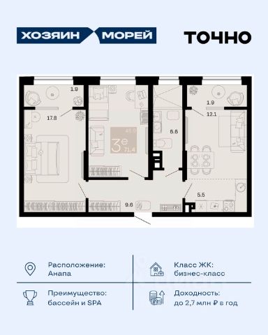 Жилой комплекс включает в себя корпуса высотой от 8 до 12 этажей. Дома возведены по качественной монолитной технологии строительства, с использованием комбинированных фасадов. В здании выполнена дизайнерская отделка входных групп и установлены современные скоростные лифты. В проекте предложено множество планировочных решений классического типа: от уютных студий до просторных 3-ех комнатных квартир. Сдаются они с подчистовой отделкой, панорамными окнами и высотой потолков 2,7 метра. Территория комплекса благоустроена и озеленена. Во дворе спроектированы безопасные детские и спортивные площадки с тренажерами и многофункциональными воркаут-комплексами, предусмотрены зоны отдыха и барбекю, а также зона для выгула собак. На территории комплекса возведена школа и 2 детских сада. Для владельцев автомобилей предусмотрен подземный паркинг. Жилой комплекс расположен в развитом районе города, где есть вся необходимая инфраструктура. Недалеко от комплекса располагаются торговые центры, аптеки, пункты выдачи заказов, школы, детские сады, а также поликлиники. До центра Анапы можно добраться за 10 минут транспортом.