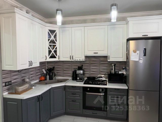 • Кухня-гостиная совмещена с зоной отдыха: двухцветные шкафы (белый верх, серый низ), белая столешница, геометрический фартук, встроенная техника (газовая плита, духовка), холодильник, кофемашина, чайник и другая мелкая бытовая техника.