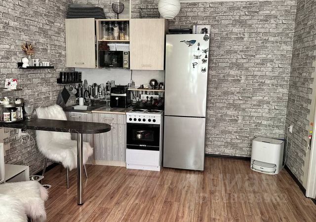Квартира-студия теплая, чистая, ухоженная, сделан косметический ремонт (обои), на полу линолеум, в ванной плитка. Продается с мебелью: диван, кухня, холодильник, шкаф угловой, комод, микроволновка, стиральная машина, кондиционер. Санузел совмещенный, душ. Коммунальные платежи невысокие.