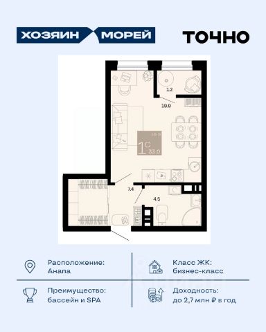 Арт. 128157414 Продается уютная квартира - студия, расположенная на 8 этаже 19-ти этажного нового современного жилого комплекса "Трио-Комфорт" в сердце Анапы в районе с развитой инфраструктурой.