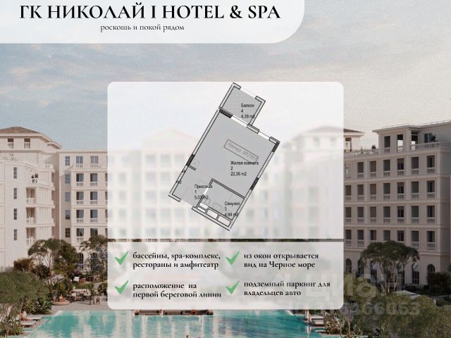 Проект состоит из 3 корпусов переменной этажности от 4 до 6 этажей. Комплекс выполнен по долговечной монолитной технологии. Фасад облицован с использованием штукатурки. В гостиничном комплексе предложено множество планировочных решений: в наличии апартаменты от 36 до 158 кв.м. Сдаются они с мебелью, панорамными окнами и высотой потолков 3 метра. Из окон номеров гостиничного комплекса открывается вид на Черное море. Комплекс расположен на первой береговой линии. В инфраструктуру гостиничного комплекса входят: бассейны, SPA-комплекс, рестораны и амфитеатр. Предусмотрен отельный оператор. Для владельцев автомобилей спроектирован подземный паркинг. Гостиничный комплекс находится в Анапе. В шаговой доступности расположены детские сады, школы, больницы, медицинские центры, торговые центры, парки культуры и отдыха. Дорога до центра города занимает 10 минут на транспорте.