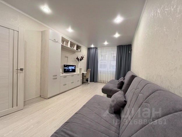 - Сама квартира очень уютная, с ремонтом, полностью готова для проживания, есть вся необходимая мебель. Комфортная планировка: Просторный коридор 4,8 кв. м., санузел 4 кв. м., гардеробная 2,9 кв. м., светлая комната 16,8 кв. м., и просторная кухня- гостиная 12,9 кв. м., с входом на балкон 3,8 кв. м.