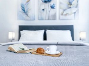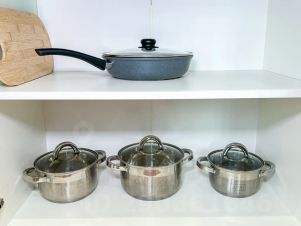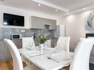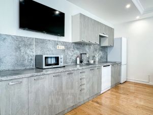 В апартаментах: полноценная кухня со всей необходимой посудой, обеденный стол, 4 стула, холодильник, посудомоечная машина, микроволновка, чайник, электроплита. Двуспальная кровать с ортопедическим матрасом, двуспальный диван, фен, сушилка для белья, гладильная доска и т. д.