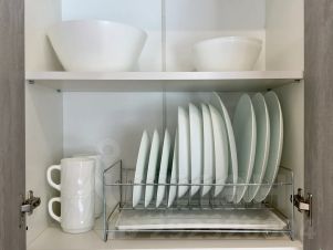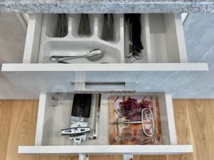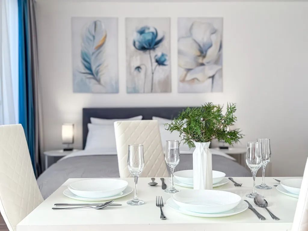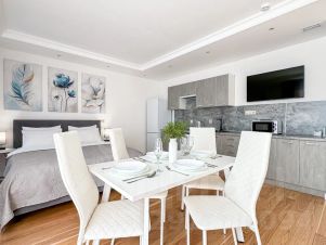 В апартаментах полноценная кухня со всей необходимой посудой, обеденный стол, 4 стула, холодильник, посудомоечная машина, микроволновка, чайник, электроплита. Двуспальная кровать с ортопедическим матрасом, двуспальный диван, фен, сушилка для белья, гладильная доска и т. д.