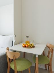 Двуспальная кровать с ортопедическим матрасом - трансформер, что позволяет преобразить зону спальни в зону гостиной. В зоне кухни можно найти все необходимое для приготовления: холодильник, плита, микроволновая печь, чайник и набор посуды. В распоряжении предоставляется фен и банные принадлежности.