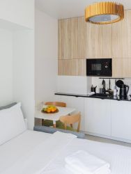 Двуспальная кровать с ортопедическим матрасом - трансформер, что позволяет преобразить зону спальни в зону гостиной. В зоне кухни можно найти все необходимое для приготовления: холодильник, плита, микроволновая печь, чайник и набор посуды. В распоряжении предоставляется фен и банные принадлежности.
