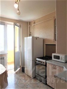 кухня (кухонный гарнитур, двухкамерный холодильник, газовая плита, микроволновая печь, обеденная зона, табуретки), выход на лоджию;
