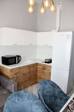 В кухне гарнитур, обеденный стол, стулья, холодильник, варочная поверхность, электрический чайник, микроволновая печь, набор необходимой посуды, стиральная машина.