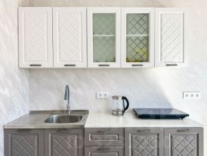 Полноценная кухня со всем необходимым: варочная поверхность, чайник, микроволновка, посуда и кухонная утварь;
