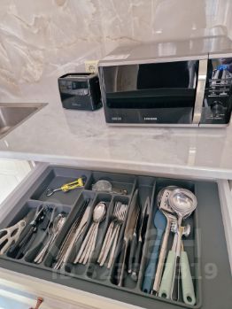 Полноценная кухня, кондиционеры (2шт), смарт телевизор (2шт), интернет, Wi-Fi, телевидение, гигиенический душ, санузел раздельный, бойлер на случай отключения горячей воды (а так в комплексе всегда есть центральная вода), стиральная машина, пылесос, холодильник, духовка и электроплита, микроволновая печь, электрический чайник, фен, утюг, турка, вся необходимая посуда и даже больше.