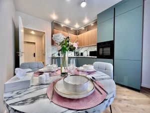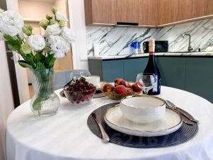Укомплектованная кухня - столовая (сплит, кофе - машина, духовой шкаф, посудомоечная машина, стиральная машина, холодильник с морозильной камерой, блендер);