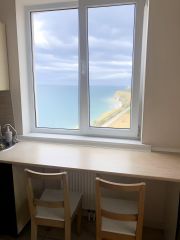 В квартире открытый балкон с видом на море, маяк, прогулочную набережную и потрясающие закаты. Оборудован уличной мебелью — столик и стулья.
