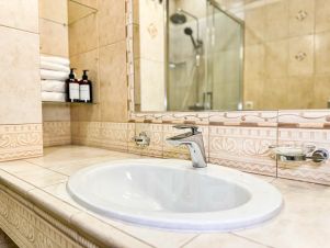Гостей ждут современные удобства: две двуспальные кровати, диван, телевизор, сплит-система, бесплатный Wi-Fi и балкон с мебелью для отдыха. Ежедневная уборка, смена полотенец и постельного белья (1 раз в 3 дня) обеспечат безупречный сервис. В каждой ванной комнате вы найдёте фен, халаты, тапочки и туалетные принадлежности. Люкс — это сочетание роскоши, функциональности и домашнего уюта для вашего идеального отдыха.