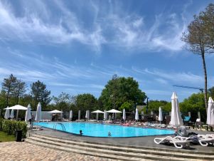 -НА ТЕРРИТОРИИ КОМПЛЕКСА БОЛЬШОЙ ПОДОГРЕВАЕМЫЙ БАССЕЙН с зоной отдыха, шезлонгами, зонтами.