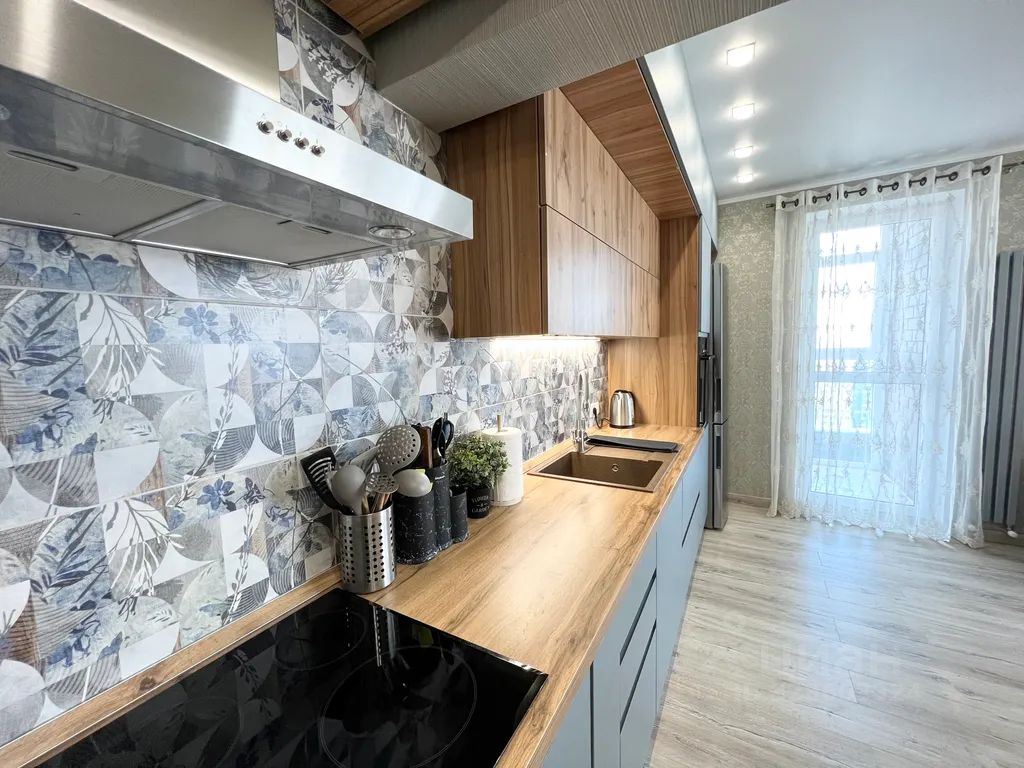 Просторная кухня-гостиная 30 м² с огромным диваном (почти 4 метра);