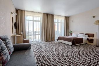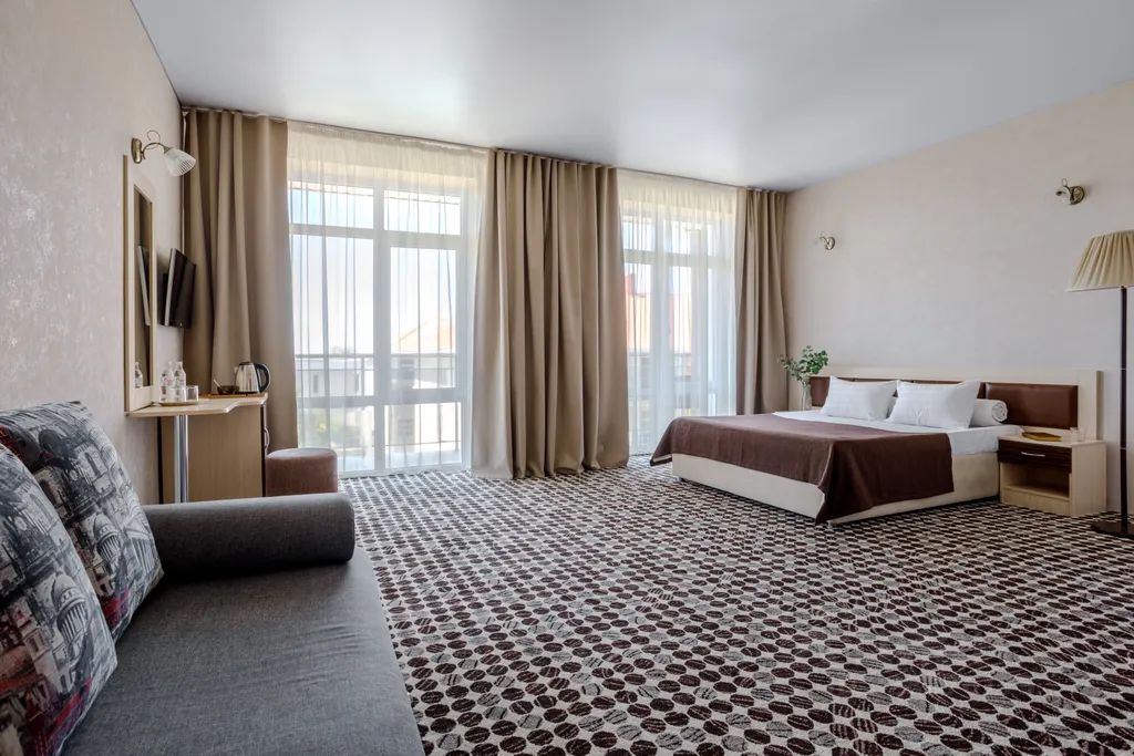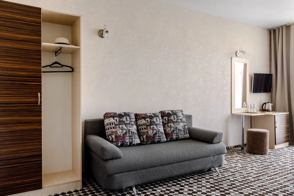 Просторный однокомнатный номер рассчитан на размещение двоих гостей на основных местах и двоих гостей на дополнительном месте (диван-кровать 140180 см) и одного ребёнка до 5 лет включительно без предоставления доп.места.