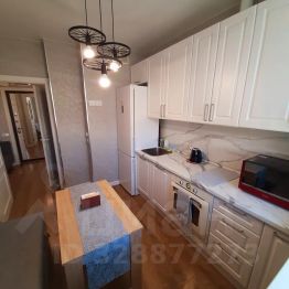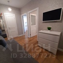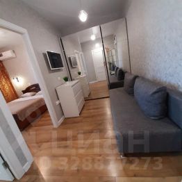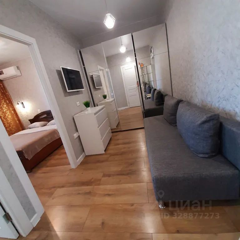 В квартире 5 спальных мест. Комната, большая гостинная, лоджия с оборудованным рабочим столом. Кухня оснащена всем необходимым: посудой, духовым шкафом, микроволновкой, посудомоечной машиной, холодильником, индукционной электрической плитой, так же здесь есть раздвижной диван для ребёнка. В комнате большая двуспальная кровать, комод и ТВ.