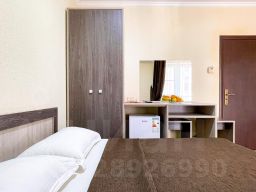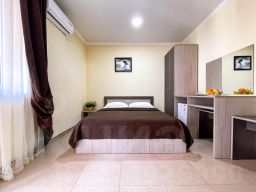 Номер Полулюкс (20кв.м., вместимость 2+1, двуспальная или две односпальные кровати(0,8*1,9м), дополнительное место еврораскладушка или детская кроватка бесплатно, душ, туалет, ТВ, холодильник, кондиционер, балкон) В цену включено: проживание в номере, бассейн с подогревом, ежедневные анимационные программы, детская площадка, батут, встреча на ЖД вокзале. Бесплатно прогулочные коляски, детские кроватки, стульчики для кормления, ванночки, горшки и т.п. Стоимость номеров никак не зависит от количества гостей. Дополнительные места предоставляются бесплатно.