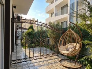 Номер оснащен: двуспальная кровать или две односпальные кровати, прикроватные тумбочки, шкаф, сейф, вешалка, стол, пуфик, зеркало, журнальный столик, чайная станция, мини-холодильник, телевизор, кондиционер. Ванная комната: душ, раковина, зеркало, фен, туалет, банные принадлежности. Терраса с летней мебелью и кресло-кокон.