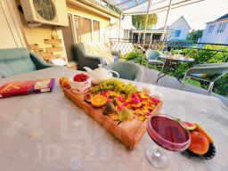 На первом этаже гостевого дома расположена оборудованная общая просторная кухня, где имеется все необходимое для приготовления пищи: Микроволновая печь, холодильник, чайник, духовой шкаф, набор необходимой посуды, столовые приборы. В номерах категории "Двухкомнатные апартаменты" на летней террасе расположены столики для отдыха.