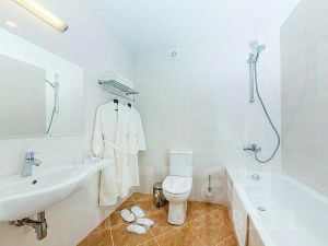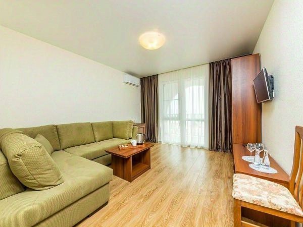 В номере имеется двуспальная кровать, диван, кондиционер, телевизор, шкаф, стол, собственная ванная комната и туалет.