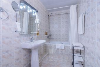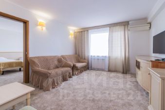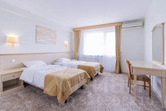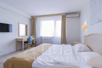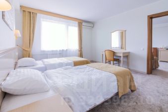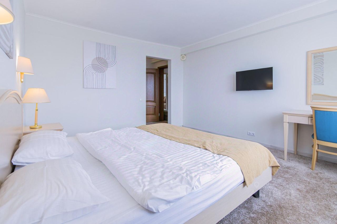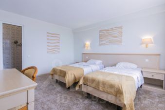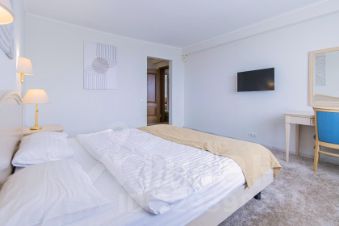 Трехкомнатный номер с видом на море площадью 48 м2 с двумя санузлами и балконом. В одной комнате двуспальная кровать, в другой две односпальные кровати, в гостиной два раскладных кресла. Санузлы номера оснащены ванной и душем. В номере: кондиционер, LED телевизор, мини-холодильник, письменный стол и стулья, журнальный столик, шкаф для одежды, тумбы, багажная тумба, сервант, пуф, зеркало, телефон, фен, чайная станция. Идеально подходит большим семьям с детьми, дружеским компаниям и самым требовательным гостям.