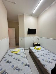 Две комнаты, в каждой комнате сан. узел, ТВ, холодильник, сплит система. В первой комнате две односпальные кровати. Во второй комнате двухспальная кровать.