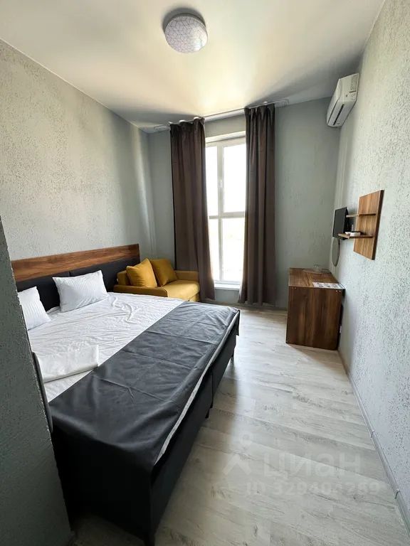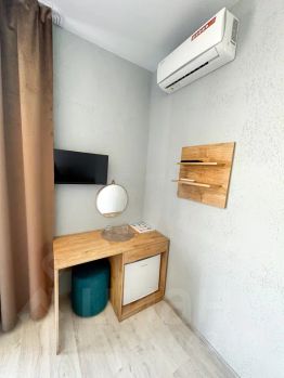 Имеется телевизор, кондиционер, вешалка, зеркало, рабочий стол, холодильник, стулья.