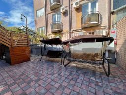 Здание состоит из 2-х этажей, общей площадью 300.6 м2 и придомовой территории, состоящей из внутреннего дворика, оборудованного кухней, зонами отдыха, беседками и барбекю.