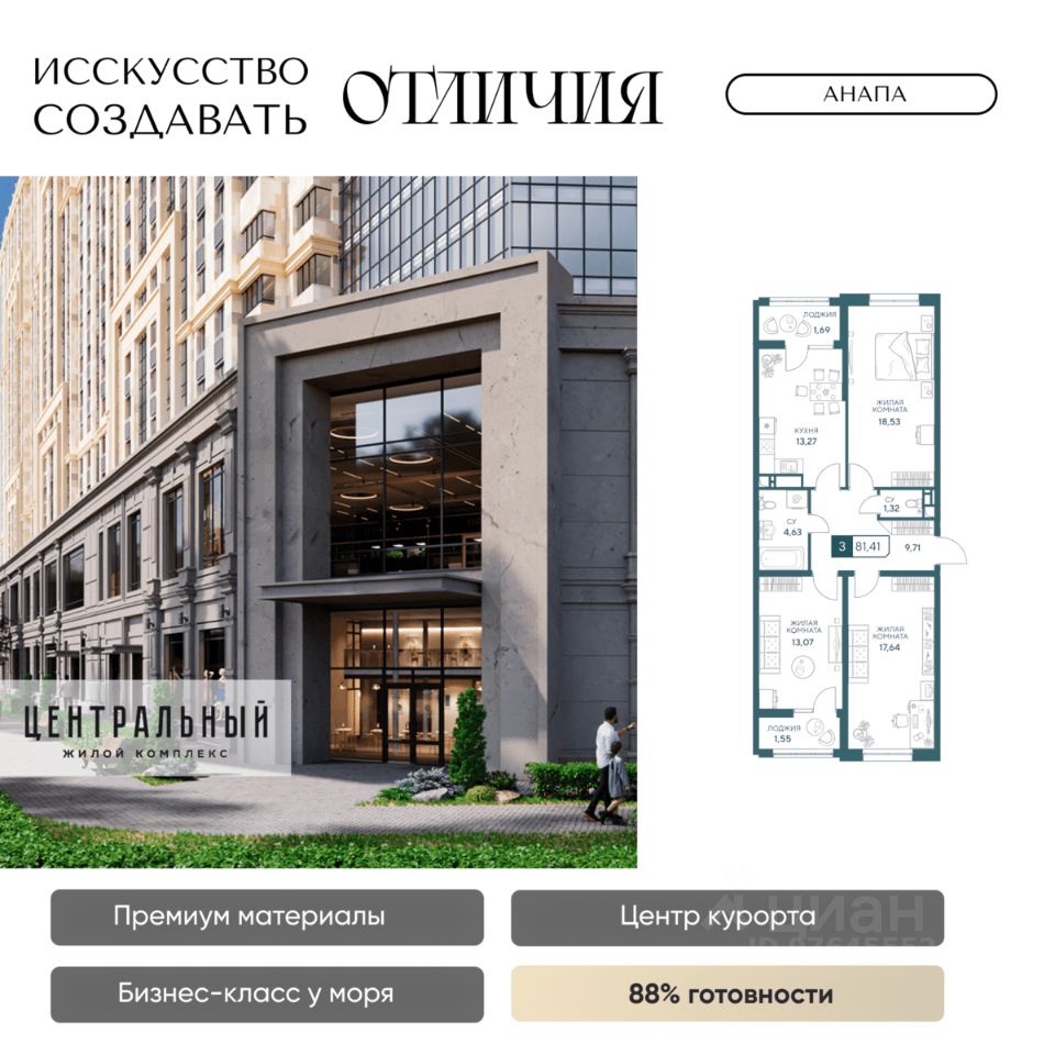 Жилой комплекс бизнес-класса "Центральный" в Анапе. Образец архитектурного искусства в центре курорта, для вашей респектабельной жизни у моря. Готов на 85%, сдаем уже в 2026 году! Для тех, кто ценит долговечность материалов, море в 10 минутах и шикарные виды без туристической суеты, кто привык к современному комфорту, и ценит время. Жить в комфорте, а не в пробках просто. Магазины сильных брендов, эстетика натурального камня в торговой галерее прямо в доме. Красивый шоппинг и новая точка притяжения в городе ЖК бизнес-класса "Центральный". Кафе, пекарни, а также большой развлекательный центр для детей и своя частная гимназия. Натуральные материалы в отделке фасада и во дворе. Фасад из натурального мрамора выделяет дом на фоне остальных мозаикой из 4 песчаных оттенков. Камень прекрасен сам по себе, что в доказательствах не нуждается, ведь прослужит долгие годы и сохранит дом на целые поколения. Приватный двор с гранитными пешеходными дорожками и озеленением с более чем 50 видами деревьев и растений. Современные детские и спортивные площадки, зона отдыха с фонтаном и ароматным садом пряный трав. Релакс после насыщенного дня дома, в окружении пышной зелени, водным охлаждением в жару и в безопасности: ведь двор закрыт, и как дом, лифты и паркинг под наблюдением видеокамер 24/7. Лифты скоростные и бесшумные, оснащены оборудованием для стабильного сигнала мобильной связи, удобно доставят вас от двери квартиры в подземный паркинг. VIP-клиентам премиум квартиры в панорамной башне (квартиры закрыты к продаже, по согласованию с менеджером обсуждается персональная стоимость) Премиум предложения всего две квартиры на этаже общей площадью 130 м2. Индивидуальные лифты с доступном в паркинг, панорамное остекление с защитой от ультрафиолета, потрясающие виды на город и горы, в перспективе на Храм. Красивая жизнь в центре курорта в достойном окружении уже ждет! До новой квартиры у моря один звонок. Застройщик "Гамма": 8 ЖК в Анапе сдано точно в срок, славимся постоянными покупателями. Предоставим условия покупки, выгодные именно вам: рассрочка, ипотечные программы по сниженным ставкам и увеличенной суммой ипотеки.