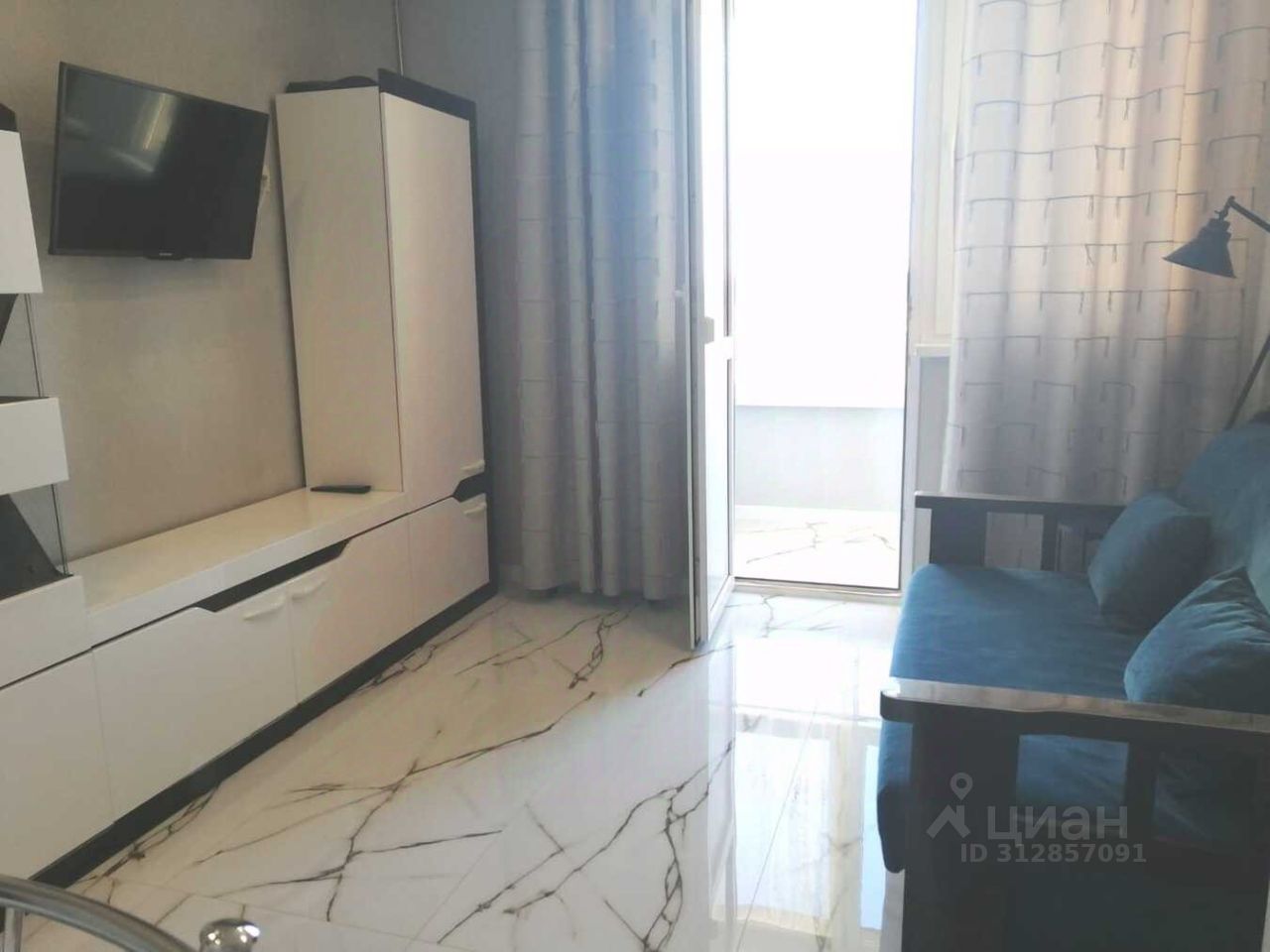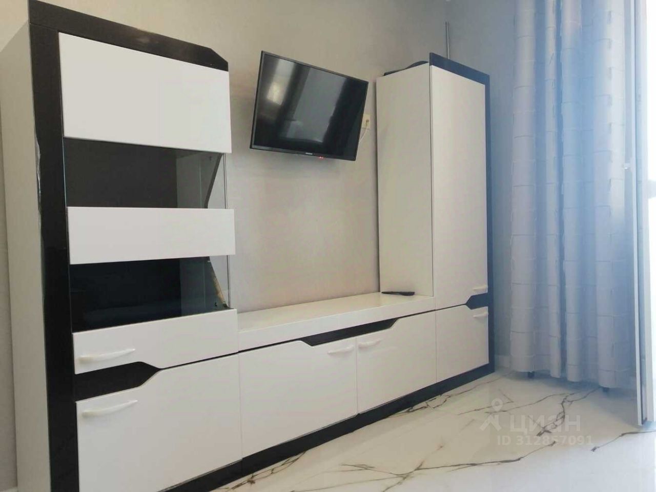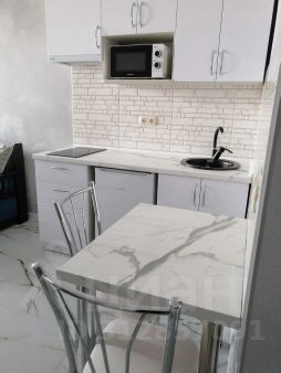 Выделена кухонная и обеденная зона, есть плита, холодильник, микроволновка. В комнате диван - кровать, лампа напольная, телевизор, полки шкаф, ящики. Совмещенная ванная комната в которой есть водонагреватель, раковина с тумбой, унитаз и душевая, полотенцесушитель, стиральная машина. Коридор с тумбочкой для обуви, вешалкой, зеркало в пол. Остаётся вся мебель и техника. Счётчики горячей и холодной воды.