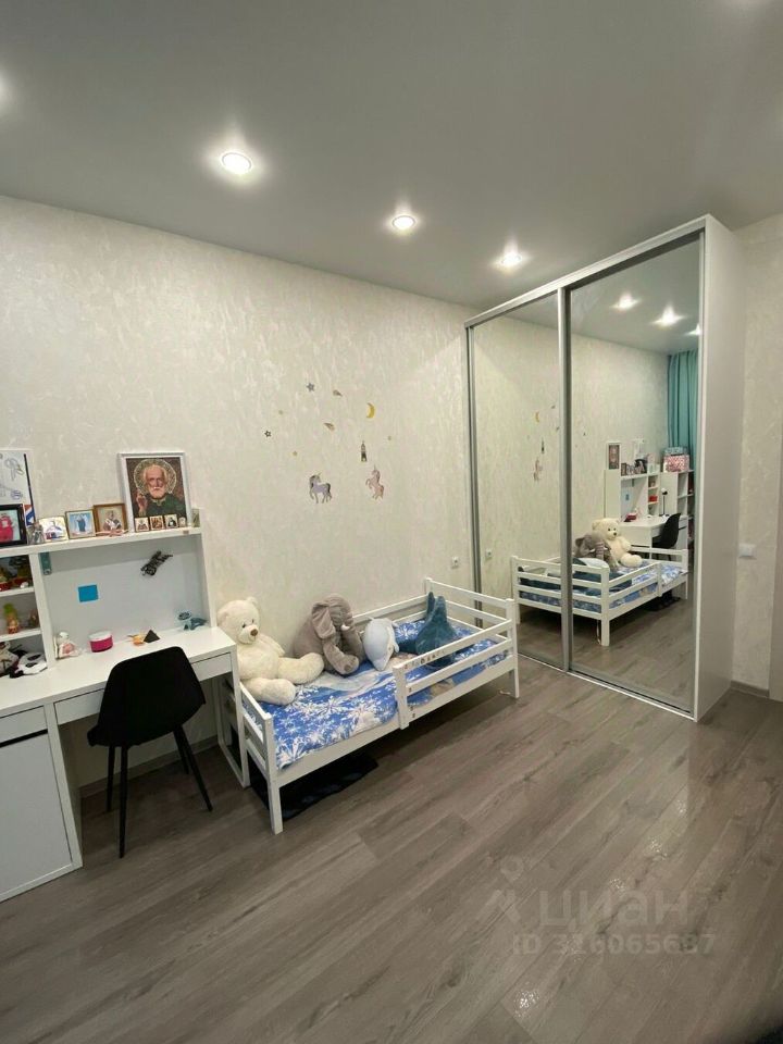 В комнате детская кровать, огромный шкаф-купе, стол письменный, стеллаж.