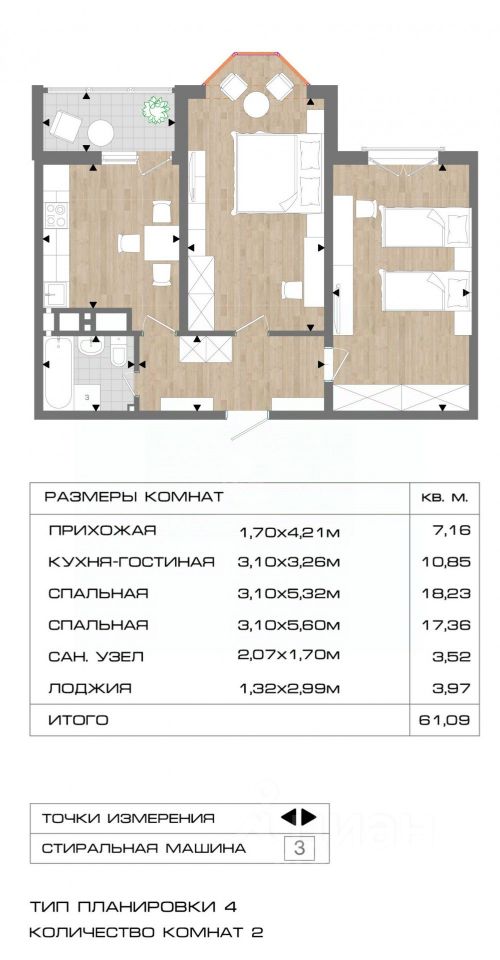 1 лоджия, 1 балкон