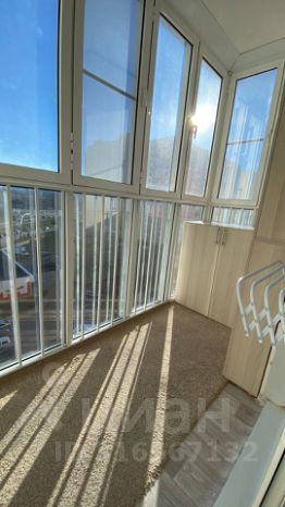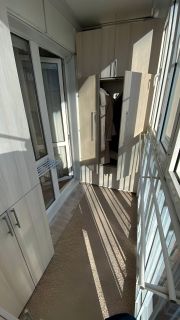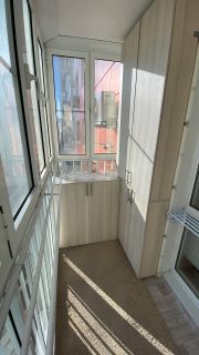 Балкон большой, застеклен до пола, где разместили шкафы и шкафчики. На балконе очень приятно посидеть на пуфике и попить чай. Выход на балкон из кухни.