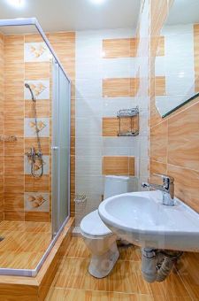 В ванной на стенах и на полу кафель кремового цвета, установлена душевая кабина.