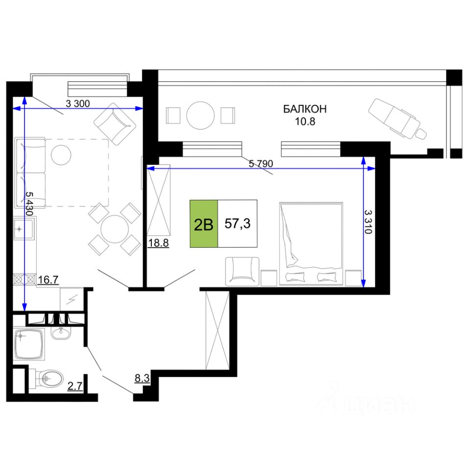 Общая площадь57,3 м²