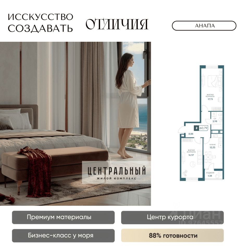 Жилой комплекс бизнес-класса "Центральный" в Анапе. Образец архитектурного искусства в центре курорта, для вашей респектабельной жизни у моря. Готов на 85%, сдаем уже в 2026 году! Для тех, кто ценит долговечность материалов, море в 10 минутах и шикарные виды без туристической суеты, кто привык к современному комфорту, и ценит время. Жить в комфорте, а не в пробках просто. Магазины сильных брендов, эстетика натурального камня в торговой галерее прямо в доме. Красивый шоппинг и новая точка притяжения в городе ЖК бизнес-класса "Центральный". Кафе, пекарни, а также большой развлекательный центр для детей и своя частная гимназия. Натуральные материалы в отделке фасада и во дворе. Фасад из натурального мрамора выделяет дом на фоне остальных мозаикой из 4 песчаных оттенков. Камень прекрасен сам по себе, что в доказательствах не нуждается, ведь прослужит долгие годы и сохранит дом на целые поколения. Приватный двор с гранитными пешеходными дорожками и озеленением с более чем 50 видами деревьев и растений. Современные детские и спортивные площадки, зона отдыха с фонтаном и ароматным садом пряный трав. Релакс после насыщенного дня дома, в окружении пышной зелени, водным охлаждением в жару и в безопасности: ведь двор закрыт, и как дом, лифты и паркинг под наблюдением видеокамер 24/7. Лифты скоростные и бесшумные, оснащены оборудованием для стабильного сигнала мобильной связи, удобно доставят вас от двери квартиры в подземный паркинг. VIP-клиентам премиум квартиры в панорамной башне (квартиры закрыты к продаже, по согласованию с менеджером обсуждается персональная стоимость) Премиум предложения всего две квартиры на этаже общей площадью 130 м2. Индивидуальные лифты с доступном в паркинг, панорамное остекление с защитой от ультрафиолета, потрясающие виды на город и горы, в перспективе на Храм. Красивая жизнь в центре курорта в достойном окружении уже ждет! До новой квартиры у моря один звонок. Застройщик "Гамма": 8 ЖК в Анапе сдано точно в срок, славимся постоянными покупателями. Предоставим условия покупки, выгодные именно вам: рассрочка, ипотечные программы по сниженным ставкам и увеличенной суммой ипотеки.