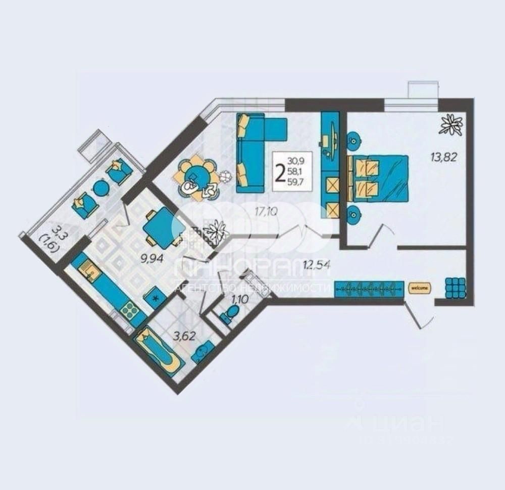 - Общая площадь квартиры 61,6 кв.м.