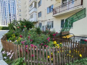 Во дворе детская игровая и спортивные площадки, тренажёры, футбольная площадка, большая парковка.