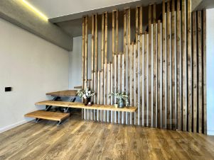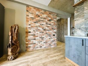 Ремонт производился с тщательным контролем качества каждого этапа. В отделке квартиры использовались натуральное дерево, керамогранит Kerama Marazzi, декоративный кирпич White hills, краски и декоративная штукатурка Dali, сантехника Grohe, Roca. Практически вся мебель изготовлена на заказ по индивидуальным чертежам. Многоточечная система освещения, электрокамин, авторские аксессуары создают интересные акценты в интерьере.