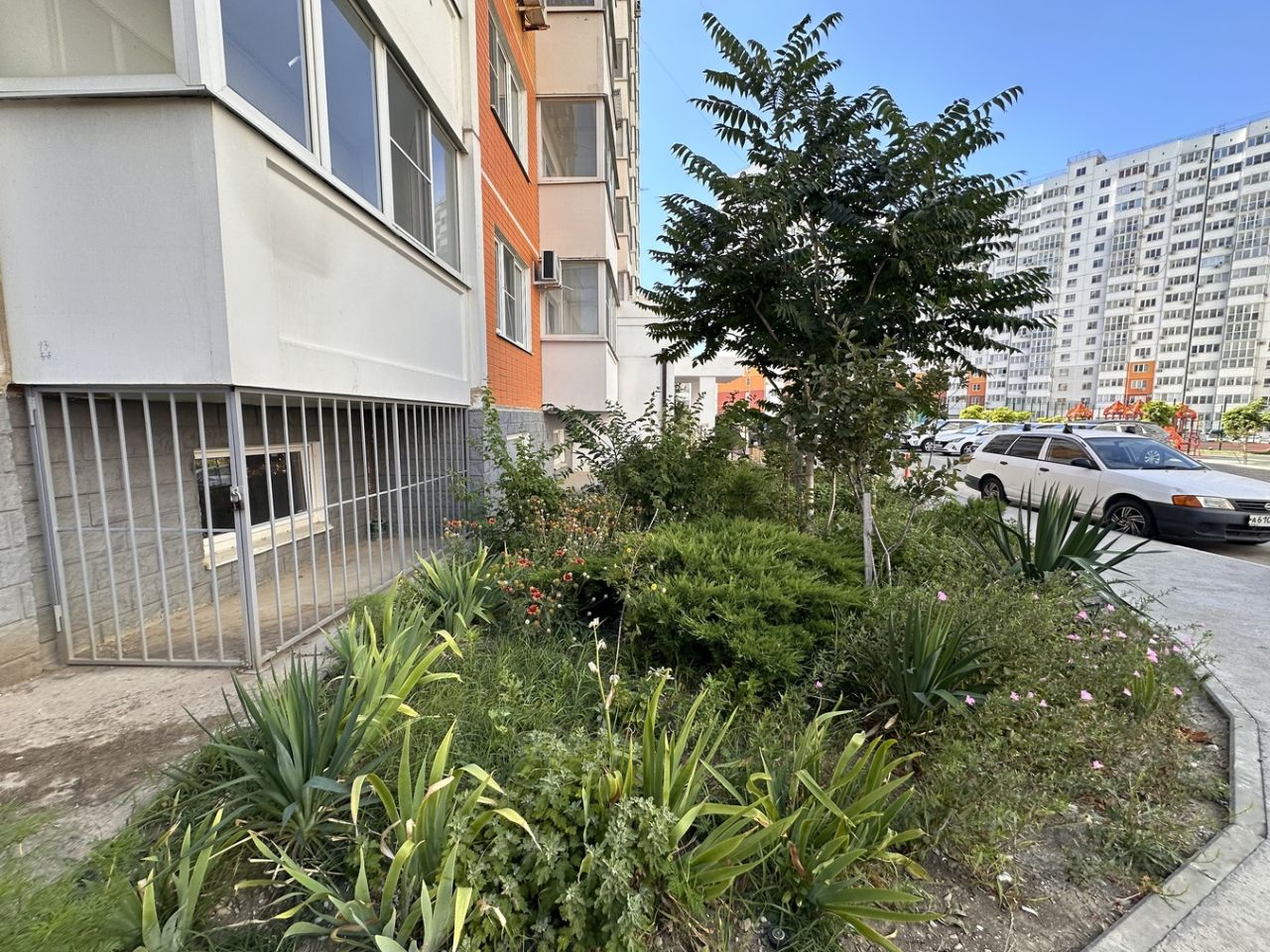 Уютный двор с дизайнерским озеленением, высажены лиственные и хвойные деревья, кустарники и цветы, обустроены рулонные газоны.