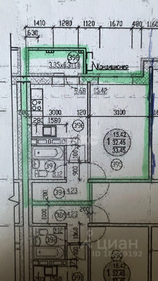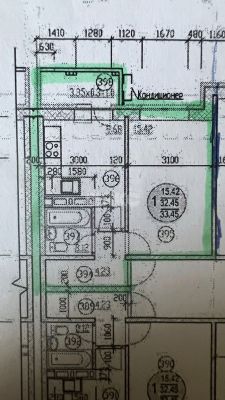 Квартира состоит из просторной кухни 10 кв.м. и комнаты с отгороженными спальными местами 15.42 кв.м, санузла- 3.83кв.м, прихожей-4.23кв.м и балкона в целых 3.35кв.м