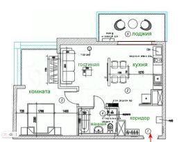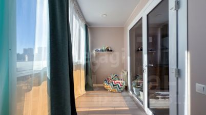 Квартира общей площадью 63 кв. м: большая кухня (17 кв. м), гостиная (16 кв. м), спальная комната (18 кв. м) с панорамным остеклением, лоджия (8,1 кв. м) и санузел (4 кв. м).