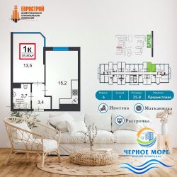 - уютная квартира общей площадью 35,80 кв.м., жилая комната 13,2 кв.м., а также просторная кухня-гостиная 15,2 кв.м