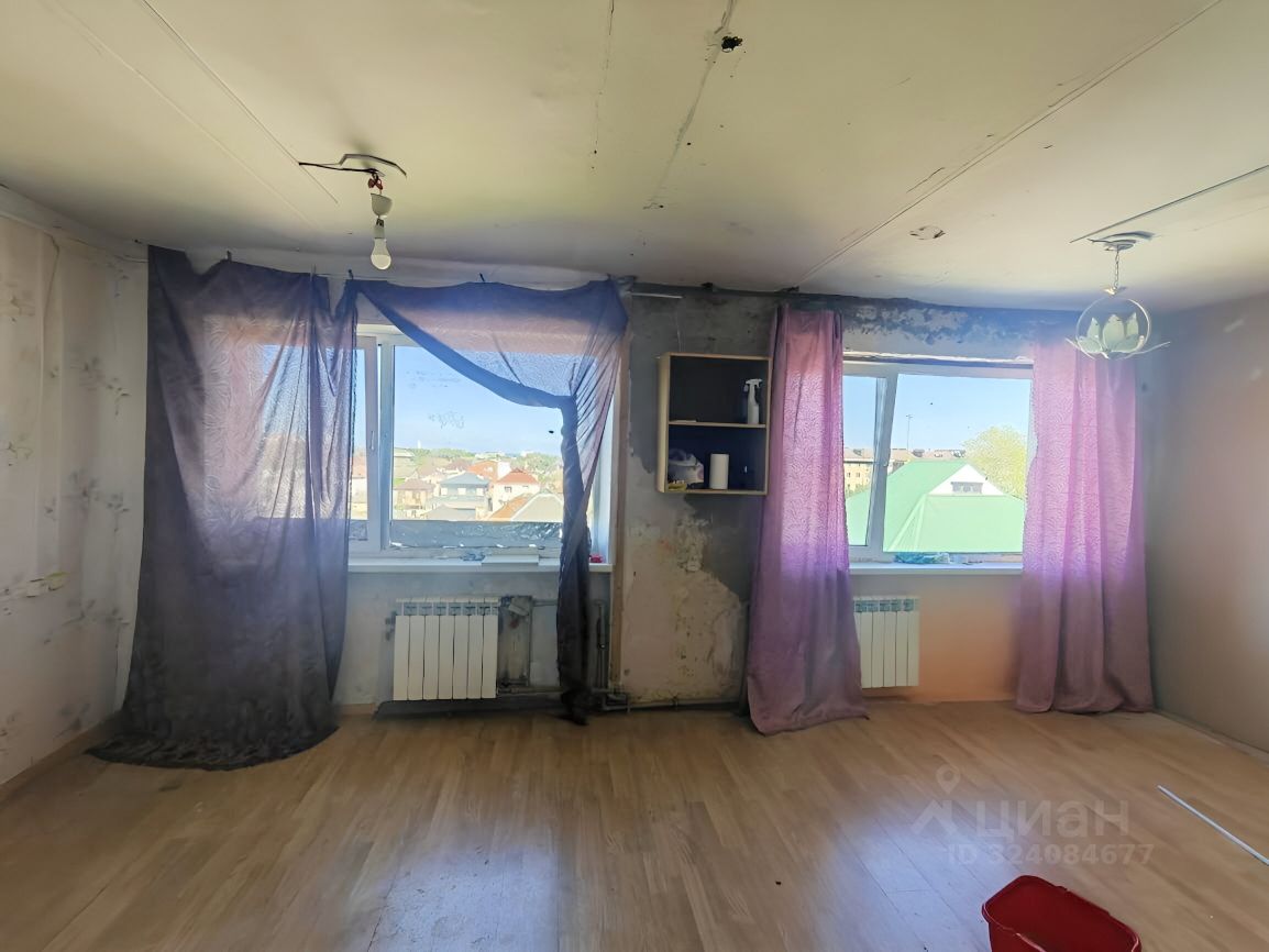 В комнате два больших окна. Есть возможность сделать перегородку и получится две комнаты либо оставить одну для большего пространства.