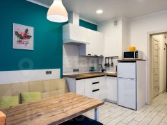 Площадь для студии очень хорошая - 27 кв.м. В ней комфортно размещены функциональные зоны полноценной кухни и гостиной. Удачно подобранная мебель позволяет удобно расположиться отдыхающим.